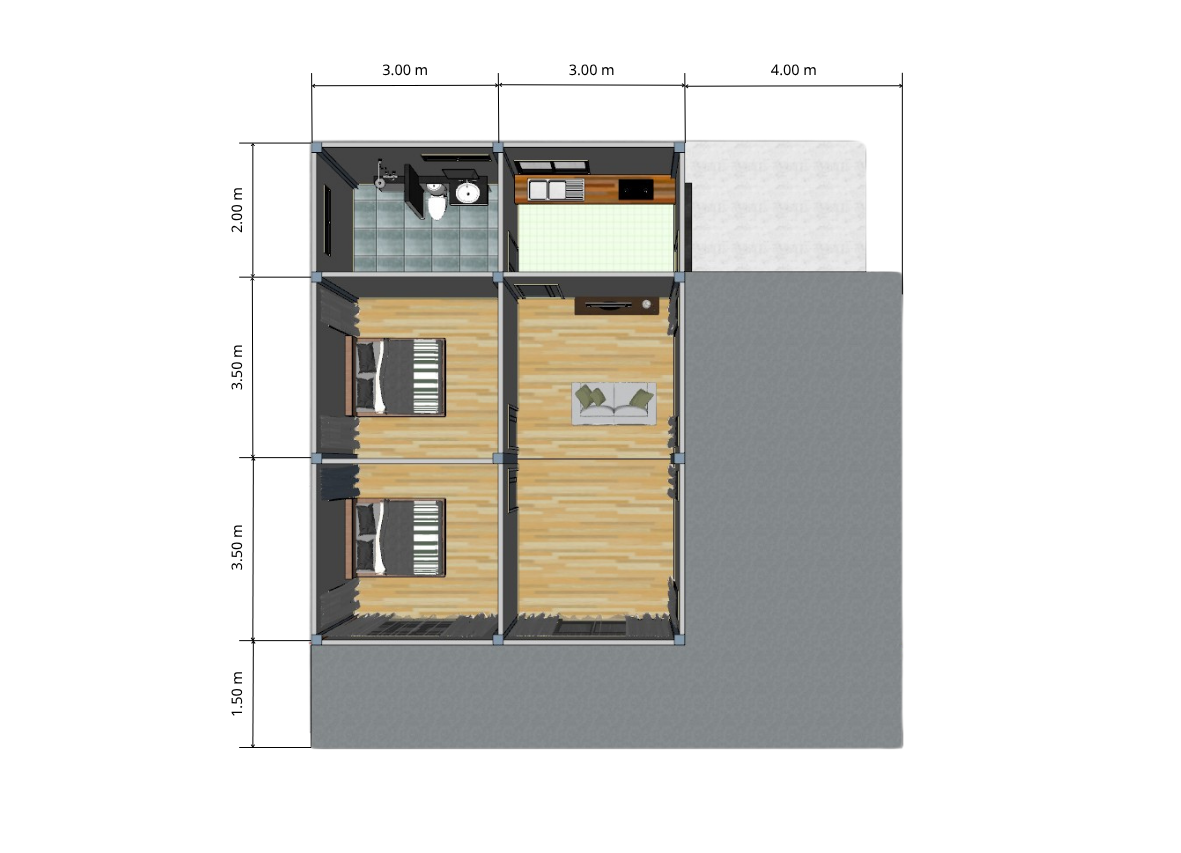 • ห้องนอน: 2 ห้อง (ขนาดห้องละ 3.50 x 3.00 เมตร)